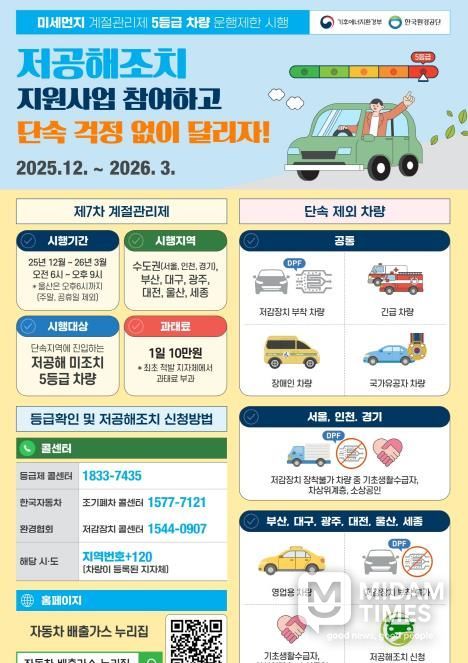 이번 제7차 계절관리제는 12월 1일부터 내년 3월 31일까지이며, 기간 내 배출가스 5등급 차량이 수도권(서울ˑ경기ˑ인천) 및 6대 특ˑ광역시(부산, 대구, 광주, 대전, 울산, 세종)에서 운행 중 단속에 걸리면 1일 10만 원의 과태료가 부과된다.