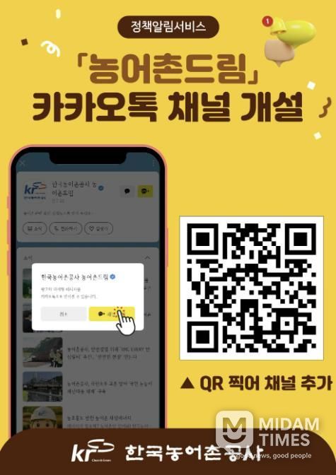 구독 방법은 간단하다. 카카오톡에서 ‘농어촌드림’을 검색하거나 포스터 QR코드(큐알코드)를 통해 접속해 농어촌드림 카카오톡 채널을 친구 추가하면 공사 소식을 받아볼 수 있다.