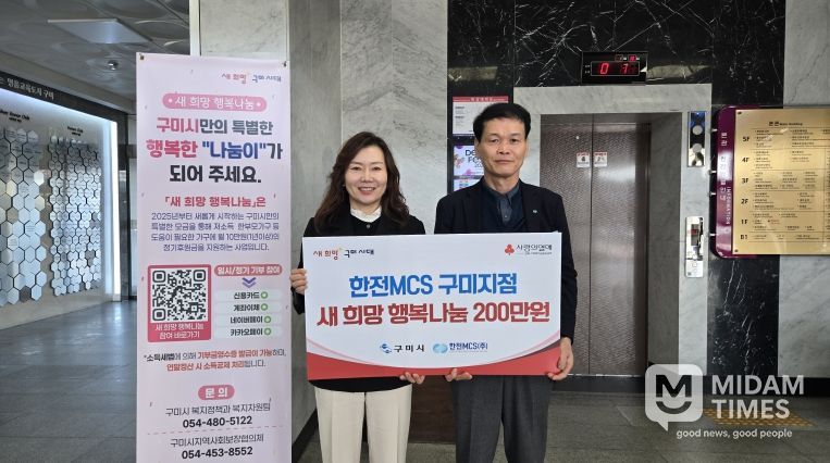 미담타임스 김준완 기자 | 구미시는 지난 18일 한전MCS 구미지점(지점장 정경우)으로부터 '새 희망 행복나눔' 성금 200만원을 기탁받았다.