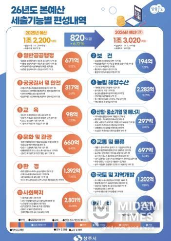 미담타임스 김준완 기자 | 상주시는 2026년 상주시의 살림을 위한 본예산안 규모를 총 1조 3,020억 원으로 편성해 11월 20일 상주시의회에 제출했다.