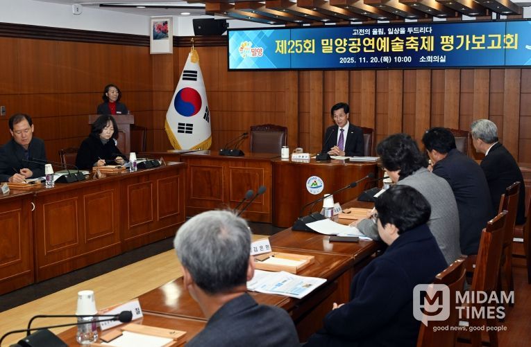 미담타임스 김교환 기자 | 경남 밀양시는 20일 시청 소회의실에서 제25회 밀양공연예술축제 평가보고회를 열고, 축제 운영 성과와 개선방안을 논의했다고 밝혔다. 이날 보고회에는 안병구 시장을 비롯한 간부공무원과 축제추진단 위원 등 20여 명이 참석했다.
