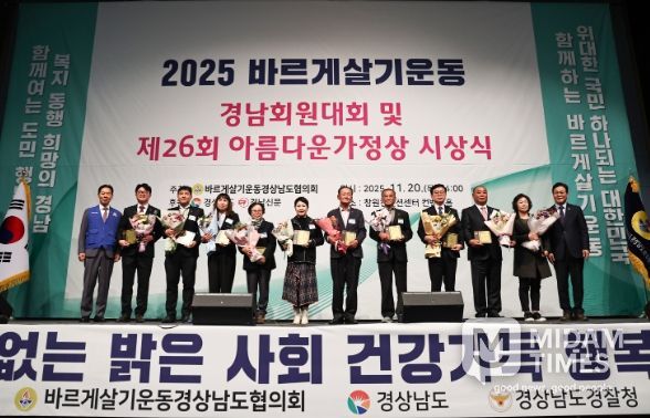 미담타임스 김교환 기자 | 경상남도가 20일 창원컨벤션센터에서 열린 ‘2025 바르게살기운동 경남 회원대회 및 제26회 아름다운 가정상 시상식’에서 지역사회 봉사에 앞장서 온 회원들을 격려했다.