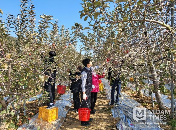 미담타임스 김준완 기자 | 대구시 군위군은 20일 군위군 소보면 봉황2리의 한 사과 농가에서 농장주가 경운기 사고로 입원하게 된 것을 계기로, 마을 주민과 공무원 30여명이 힘을 합쳐 사과 수확을 지원했다.