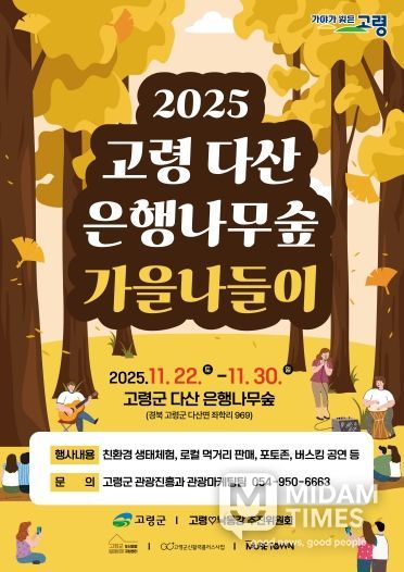 미담타임스 김준완 기자 | 고령군과 고령♡낙동강 추진위원회(위원장 성현덕)는 단풍 절정 시기에 맞춰 오는 11월 22일부터 30일까지 토·일 중심으로 다산 은행나무숲 일대에서 ‘고령 다산 은행나무숲 가을나들이 행사’를 개최한다.