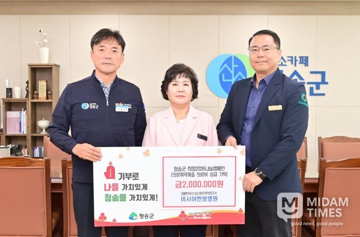 미담타임스 김준완 기자 | 청송군은 지난 21일 (재)한국수성사회의학연구소 이시아한방병원이 청송군을 방문해 관내 의료 취약계층을 위한 성금 200만 원을 기탁했다고 밝혔다.