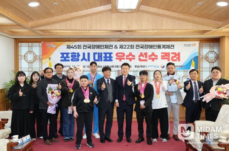미담타임스 김준완 기자 | 포항시는 21일 시청 대외협력실에서 제45회 전국장애인체육대회에 참가한 포항시 선수단 격려 행사를 열고 뛰어난 성과로 포항 체육의 위상을 높인 선수와 지도자들의 노고를 격려했다.