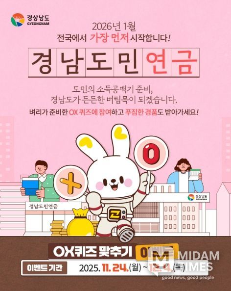 장수환 경상남도 홍보담당관은 “경남도민연금은 도민의 든든한 노후를 위한 새로운 안전망의 첫걸음”이라며, 이번 퀴즈를 통해 핵심 내용을 쉽고 재미있게 접하길 바란다”고 말했다. 이어 “퇴직 후 소득 공백기에 도민들이 안정적인 생활을 이어갈 수 있도록 경남도민연금에 많은 관심과 참여를 부탁드린다”고 덧붙였다.