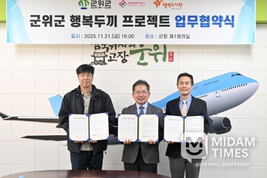 미담타임스 김준완 기자 | 군위군은 21일 행복나래 주식회사, 행복도시락사회적협동조합과 함께 '군위군 행복두끼 프로젝트' 업무협약을 체결했다. 이날 협약식에는 김진열 군수를 비롯해 행복나래(주) 조민영 본부장, 행복도시락사회적협동조합 최준 사무국장이 참석했다.
