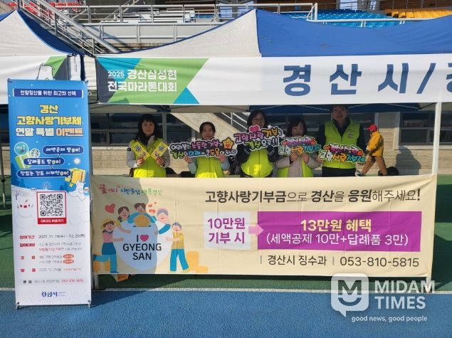 미담타임스 김준완 기자 | 경산시는 23일 경산시민운동장에서 시작하여 경산시 일대를 돌아오는 2025 삼성현 전국 마라톤대회에서 경산 고향사랑기부제 홍보를 실시했다.