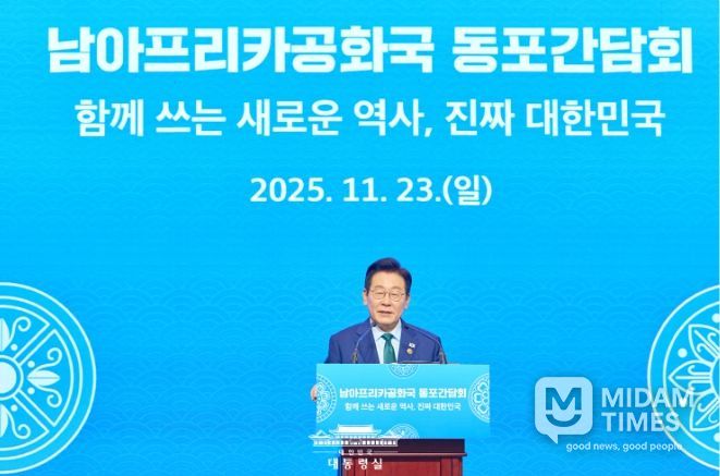 미담타임스 김교환 기자 | 주요 20개국(G20) 정상회의 참석을 위해 남아프리카공화국을 방문한 이재명 대통령은 23일(현지시간) 양국 수교 후 최초로 동포간담회를 개최해 현지에 거주하는 동포들을 격려했다.