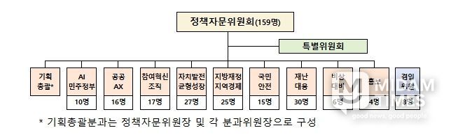 향후 1년(’25.11.24.~’26.11.23.)간 활동하게 되는 제8기 정책자문위원회는 학계·연구원·기업·시민사회 등 다양한 분야의 전문가 159명이 위촉됐으며, 행정안전부 조직개편(’25.11.25. 시행 예정) 내용과 연계해 10개 분과로 구성됐다.