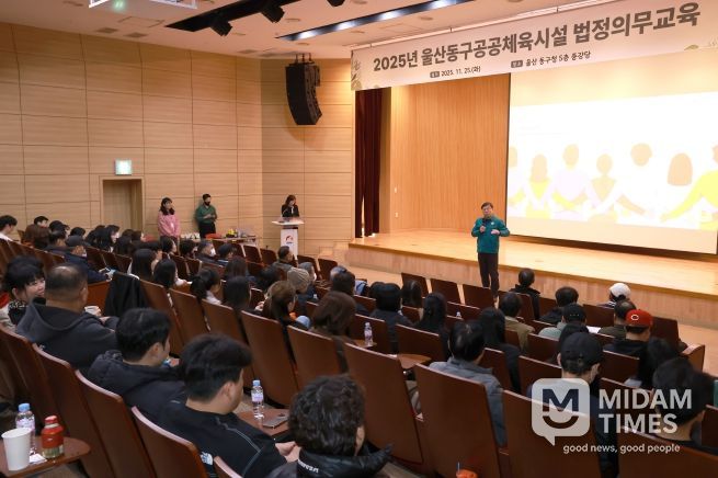 미담타임스 김준완 기자 | 울산 동구는 11월 25일 오전 9시 30분 동구청 5층 중강당에서 공공 체육시설 직원과 기간제근로자, 체육회 지도자 등 70여 명을 대상으로 2025년 법정의무교육 및 직원 친절 교육을 했다.