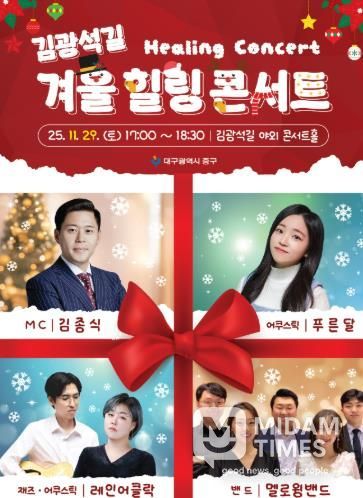 미담타임스 김교환 기자 | 대구 중구는 오는 11월 29일 오후 5시, 초겨울 추위를 달래줄 음악 공연인 ‘김광석다시그리기길 겨울 힐링콘서트’를 개최한다.