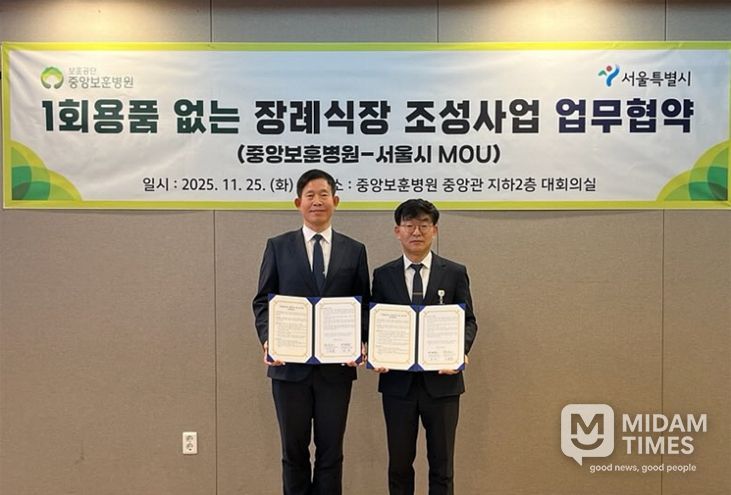 서울시는 25일 15시 중앙보훈병원과 ‘1회용품 없는 장례식장 조성을 위한 업무협약(MOU)’을 체결했다고 밝혔다. 협약식은 권 민 서울시 기후환경본부장, 이종훈 중앙보훈병원 행정부원장이 참석한 가운데 열렸다.