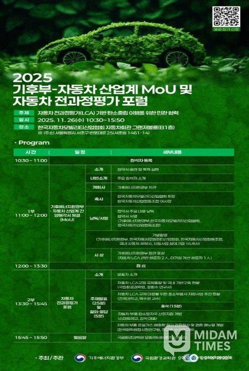미담타임스 김준완 기자 | 기후에너지환경부는 11월 26일 자동차회관(서울시 서초구 소재)에서 국내 자동차 업계와 ‘자동차 온실가스 전과정평가(LCA) 역량 강화 및 탄소중립 협력을 위한 업무협약’을 체결한다고 밝혔다.