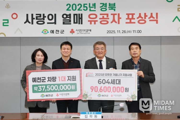 미담타임스 김준완 기자 | 예천군은 26일 오전, 경북사회복지공동모금회(회장 전우헌)가 주최하는 ‘2025 경상북도 찾아가는 이웃돕기 유공자 포상식’이 예천군청에서 열렸다고 밝혔다.