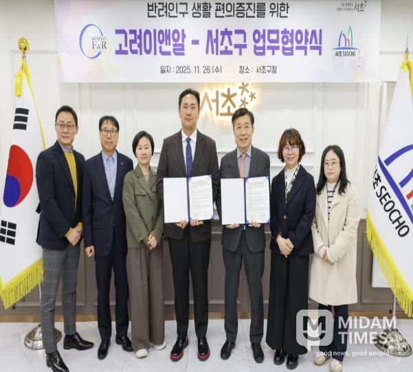 미담타임스 정주환 기자 | 서울 서초구는 26일, 반려인구의 지속적 증가에 대응해 반려인의 생활편의를 높이고 쾌적한 공원 환경을 조성하기 위해 환경관리 전문업체 ㈜고려이앤알과 '반려견 분변수거함 확대 설치 및 관리에 관한 업무협약(MOU)'을 체결했다고 밝혔다.