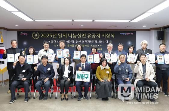 미담타임스 김교환 기자 | 대구 달서구는 지난 26일 달서구청에서 지역의 어려운 이웃을 위해 꾸준한 나눔을 실천해 온 기업·단체 및 개인 유공자들에게 감사의 뜻을 전하는 ‘2025년 나눔실천 유공자 시상식’을 개최했다.