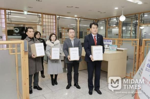 미담타임스 정주환 기자 | 하은호 군포시장이 27일 세종정부청사 국토부를 방문해 철도지하화 국가계획 반영을 촉구하는 102,193명의 군포시민의 서명이 담긴 서명부를 전달했다.