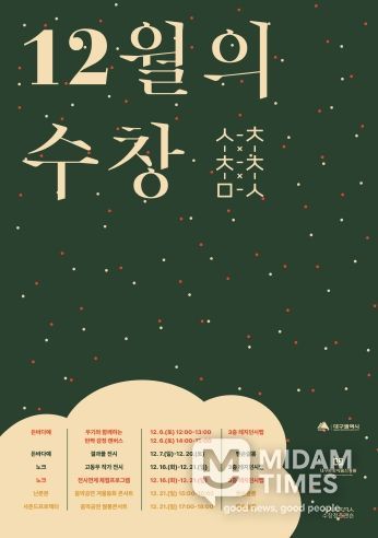 미담타임스 김교환 기자 | 대구문화예술진흥원 문화예술본부(본부장 방성택)는 올해 수창청춘맨숀 프로젝트형 레지던시에 참여한 청년예술단체들이 대구시민을 위해 준비한 시민창작아트워크 3부 '12월의 수창'을 12월 6일부터 21일까지 수창청춘맨숀 일원에서 개최한다.