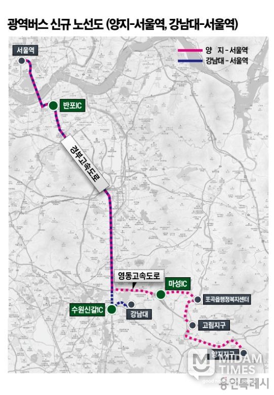 미담타임스 정주환 기자 | 용인특례시는 시의 양지지역, 강남대에서 출발해 서울역으로 향하는 광역버스 신규 노선 2개가 26일 국토교통부 대도시권광역교통위원회(대광위)의 광역버스 노선위원회 심의에서 최종 선정됐다고 27일 밝혔다.
