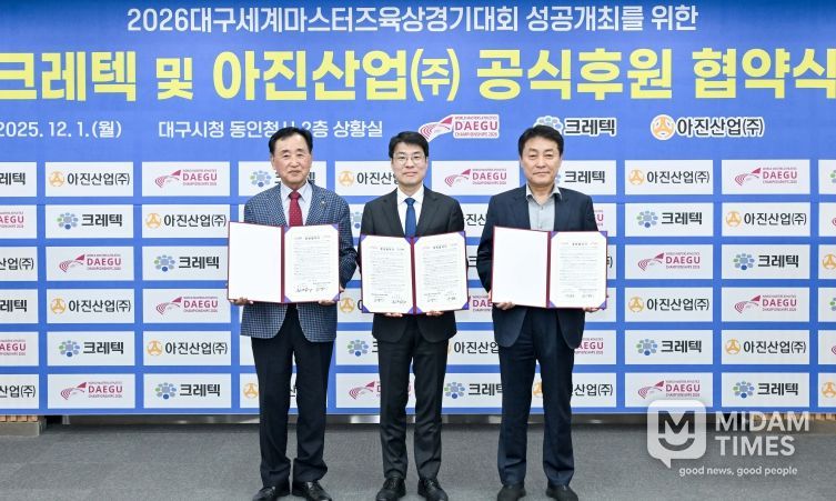 미담타임스 김교환 기자 | 2026대구세계마스터즈육상경기대회 조직위원회는 12월 1일 오전 10시 30분, 대구광역시청 동인청사에서 지역 우량기업인 크레텍 및 아진산업㈜과 공식 후원 협약을 체결했다.