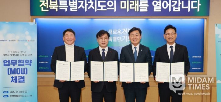 전북도는 1일 도청에서 전북은행, 농협은행, 전북사회복지공동모금회와 ‘탄소중립 햇빛나눔 업무협약’을 체결하고, 기후위기 취약계층을 위한 새로운 에너지 복지 모델을 선보였다. 이날 협약식에는 김관영 도지사, 오현곤 전북은행 부은행장, 김성훈 농협은행 전북본부장, 한명규 전북사회복지공동모금회장이 참석해 사업 취지와 향후 협력 방향을 공유했다.