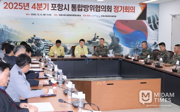 미담타임스 김준완 기자 | 포항시는 5일 포항시 통합방위상황실에서 ‘2025년 4분기 포항시 통합방위협의회 정기회의’를 개최하고 변화하는 안보 환경에 대한 대응 태세와 겨울철 재난 발생 가능성에 대비한 지역 통합방위 체계를 종합적으로 점검했다.