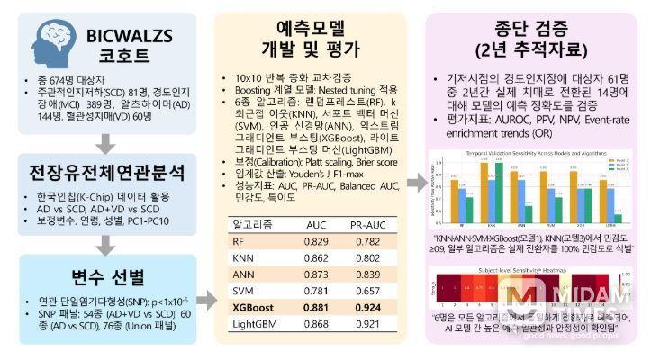 국립보건연구원은 한국인 치매 코호트인 ‘만성뇌혈관질환 바이오뱅크 컨소시엄(BICWALZS, 연구책임자: 아주대학교 홍창형 교수)’ 674명(정상 81명, 경도인지장애 389명, 치매 204명)의 임상 및 유전체 정보를 활용해 인공지능 알고리즘을 비교·분석하여 한국인 맞춤형 치매 예측 모델을 개발했다.