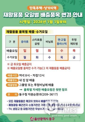 미담타임스 김준완 기자 | 울산 동구가 2026년 1월 1일부터 월요일, 목요일의 재활용품 수거 품목을 변경 시행한다고 밝혔다.