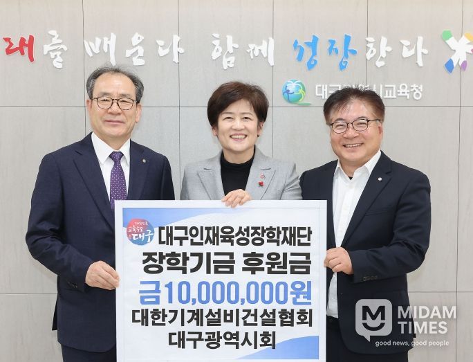 미담타임스 김교환 기자 | 대구시교육청은 12월 4일, 대한기계설비건설협회 대구광역시회(회장 이민균)에서 대구인재육성장학재단에 장학금 1천만 원을 기탁했다고 밝혔다.