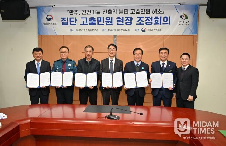 미담타임스 정인화 기자 | 완주군의회 유의식 의장과 성중기 예산결산특별위원장은 5일 국민권익위원회, 완주군, 완주경찰서, 전주국토관리사무소, 건전마을 주민 대표와 함께 운곡교 인근 교통 불편 해소를 위한 조정안에 최종 합의하고 공식 협약을 체결했다.
