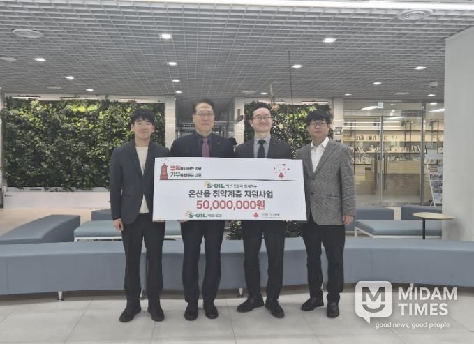 미담타임스 김준완 기자 | S-OIL 울산공장이 5일 울주군 온산읍 행정복지센터에서 이준호 온산읍장, 박성훈 S-OIL 상무, 박광철 온산읍 지역사회보장협의체 위원장, 양호영 울산사회복지공동모금회 사무처장 등이 참석한 가운데 온산읍 취약계층 지원금 5천만원을 전달했다.