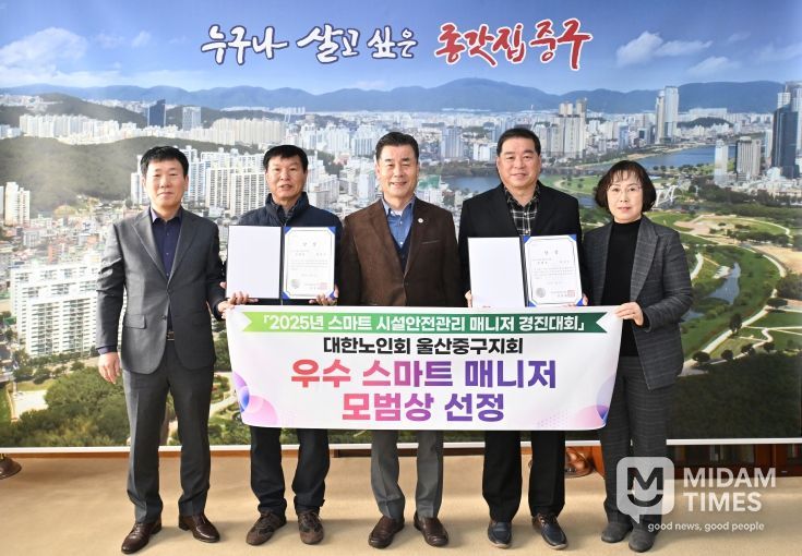 미담타임스 김준완 기자 | 대한노인회 울산중구지회(지회장 최현만)에서 운영하는 ‘노인일자리 역량활용사업단’ 참여자 2명이 국토안전관리원과 한국노인인력개발원이 공동 주관하는 ‘2025년 스마트 시설안전관리 매니저 경진대회’에서 ‘우수 스마트 매니저’로 선정됐다.