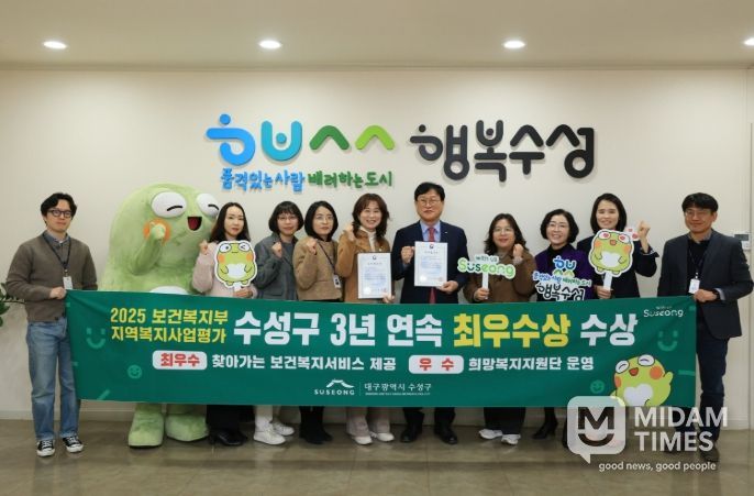 미담타임스 김교환 기자 | 대구 수성구는 2025년 지역복지사업평가에서 3년 연속 최우수상 등 2개 분야에서 수상하며 지역복지사업 추진의 우수성을 다시 한번 인정받았다.