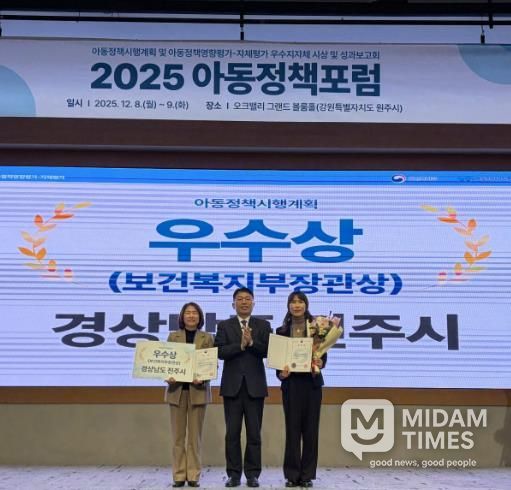 미담타임스 김교환 기자 | 진주시는 8일 강원도 원주시 오크밸리 리조트에서 열린 ‘제13회 아동정책포럼’에서 2024년 아동정책 시행계획 추진실적 평가에서 ‘우수’ 지자체로 선정돼 보건복지부 장관상을 수상했다.