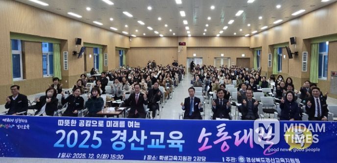 미담타임스 김준완 기자 | 경상북도경산교육지원청은 12월 9일 경산교육지원청 학생교육지원관 2강당에서 경산시장 및 도의회 의원, 관내 유․초․중․고등학교 교(원)장, 학교운영위원장, 학부모회장, 녹색어머니회, 학생상담자원봉사자, 주민감사관 및 공약이행단 대표, 교육계 원로 등 경산 교육가족 220여 명을 초청하여 ‘교육감과 함께하는 2025 경산교육 소통대길 톡’을 개최했다.