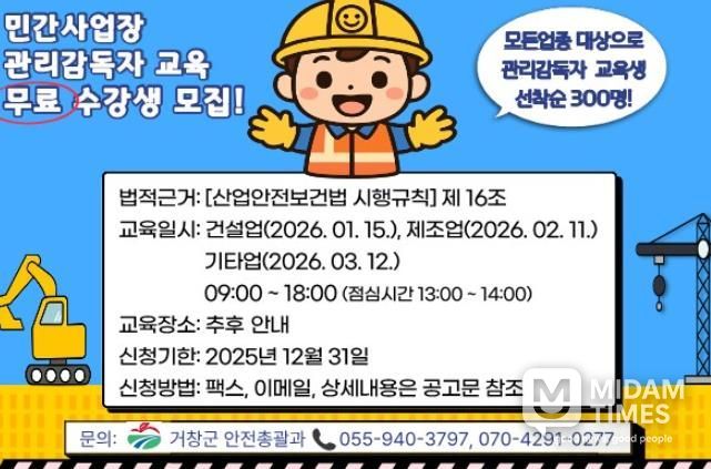 미담타임스 김교환 기자 | 거창군은 이달 31일까지 민간사업장 관리감독자를 대상으로 한 안전보건교육 참여 신청을 접수하고 있다.