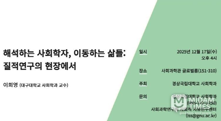 미담타임스 김교환 기자 | 경상국립대학교 사회과학연구원 사회적 치유연구센터(센터장 김명희 사회학과 교수)는 12월 17일 오후 4시 가좌캠퍼스 사회과학관 글로벌룸(151동 310호)에서 대구대학교 사회학과 이희영 교수를 초청하여 ‘해석하는 사회학자, 이동하는 삶들: 질적연구의 현장에서’라는 주제로 특강을 개최한다.