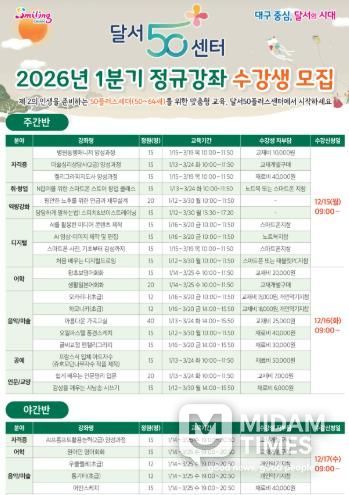 미담타임스 김교환 기자 | 대구 달서구는 12월 15일부터 24일까지 ‘2026년 1분기 달서50플러스센터 정규강좌’ 수강생을 선착순 모집한다.