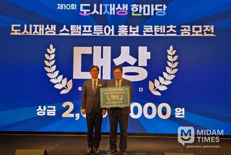 미담타임스 김교환 기자 | 밀양시도시재생지원센터는 지난 10일 국토교통부가 서울 콘래드 호텔에서 주최한 제10회 도시재생 한마당 행사에서 ‘2025 도시재생 스탬프투어 홍보 콘텐츠 공모전’ 국토교통부장관상(대상)을 수상했다.