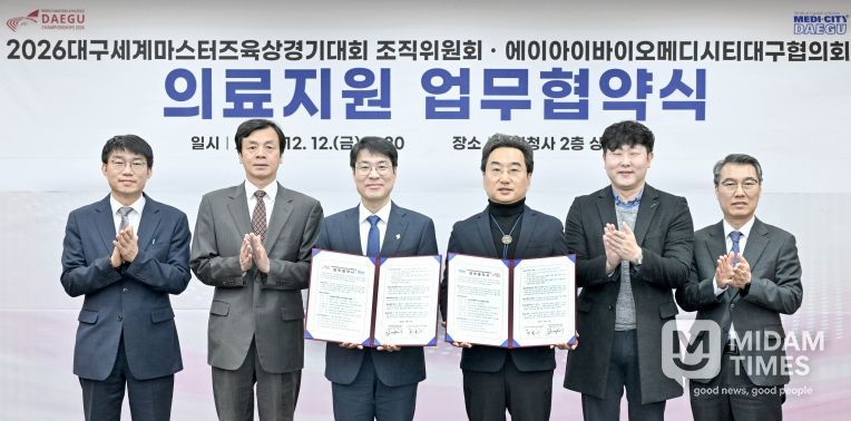 미담타임스 김교환 기자 | 2026대구세계마스터즈육상경기대회 조직위원회는 12월 12일, 대구광역시청 동인청사에서 (사)AI 바이오·메디시티대구협의회와 대회 기간 의료 공동 대응 강화를 위한 업무협약을 체결했다.