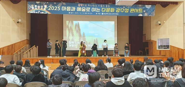 미담타임스 김준완 기자 | 경상북도청도교육지원청은 2025년 12월 12일 청도초등학교 강당에서 3~4학년 학생 140여 명을 대상으로 ‘음악으로 잇는 다름과 조화의 시간’ 다문화 감수성 콘서트를 운영했다. 이번 프로그램은 음악을 통한 감성적 경험을 기반으로 학생들의 다문화 이해와 공감 능력을 높이기 위해 마련됐다.