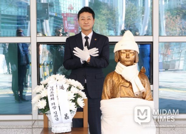 김 의장은 평화의 소녀상 앞에서 헌화와 묵념을 하며 피해자들의 희생을 가슴 깊이 되새겼다.