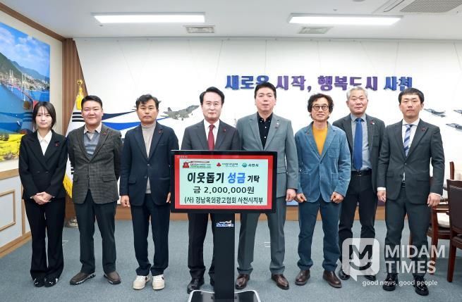 미담타임스 김교환 기자 | 사단법인 경남옥외광고협회 사천시지부에서는 ‘희망 2026 나눔캠페인’ 기간을 맞이하여 지난 15일 사천시청을 방문해 관내 저소득 가정을 위해 사용해 달라며 성금 200만 원을 기탁했다.