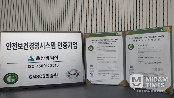 미담타임스 김준완 기자 | 울산시는 국제표준화기구(ISO)로부터 ‘안전보건경영시스템(ISO 45001)’ 국제인증을 취득했다고 밝혔다.