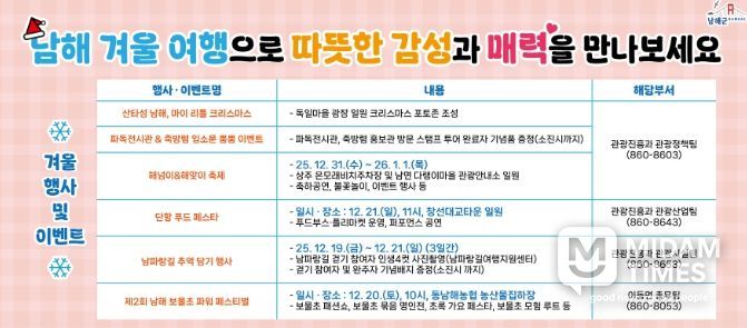 미담타임스 김교환 기자 | 남해군은 겨울 여행 관광객 유치와 체류형 관광 활성화를 위하여 다양한 매력적인 행사 ․ 이벤트를 개최한다.