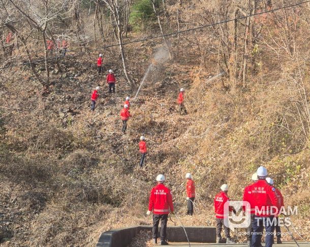 미담타임스 김교환 기자 | 남해군은 건조하고 바람이 많이 부는 겨울철을 맞아 대형 산불 발생에 대비하고, 산불진화대의 초기 진화 대응 능력을 강화하기 15일 오전 이동면 용소리 용문사 일원에서 산불대응 모의진화훈련을 실시했다.