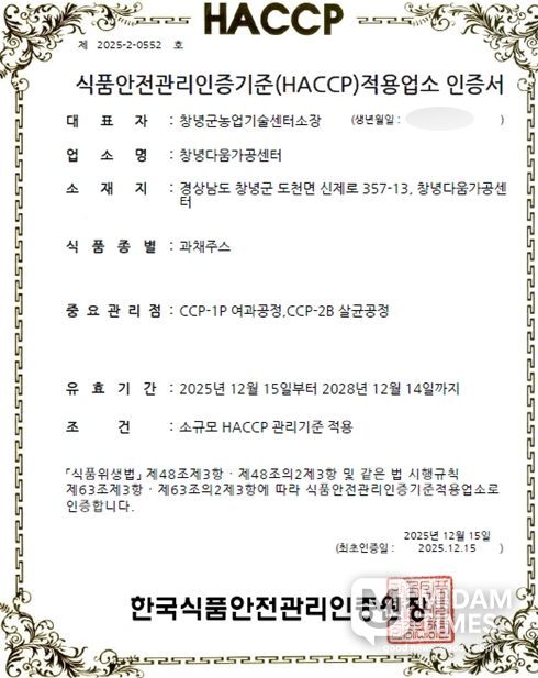이번 과채주스 HACCP 인증을 통해 체계적인 품질 및 안전 관리로 소비자에게 건강한 식품을 제공함과 동시에 농외소득 증대에도 크게 이바지할 것으로 기대된다.
