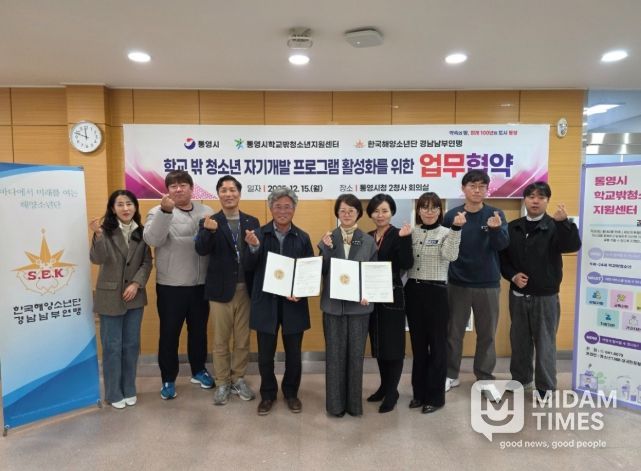 미담타임스 김교환 기자 | 통영시는 지난 15일 통영시청 제2청사 회의실에서 학교 밖 청소년 자기개발 프로그램 지원 강화 및 활성화를 위해 통영시학교밖청소년지원센터(센터장 유정옥)와 한국해양소년단경남남부연맹(연맹장 김정명) 간 업무협약을 체결했다고 밝혔다.